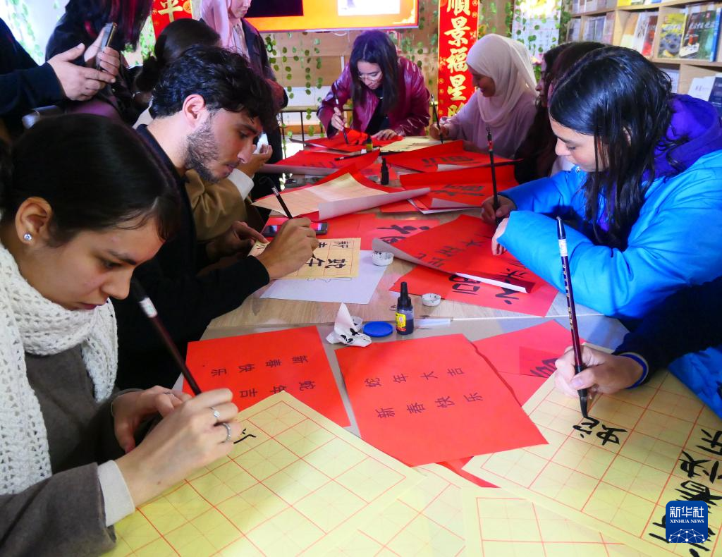 春節(jié)期間,突尼斯東方知識書店舉行了春節(jié)相關文化活動,參與者通過觀看視頻短片、有獎問答、寫福字等活動了解中國春節(jié)常識并親身體會中國年味。突尼斯迦太基大學高等語言學院中文專業(yè)學生興致勃勃地演唱了《月亮代表我的心》等中文歌曲。