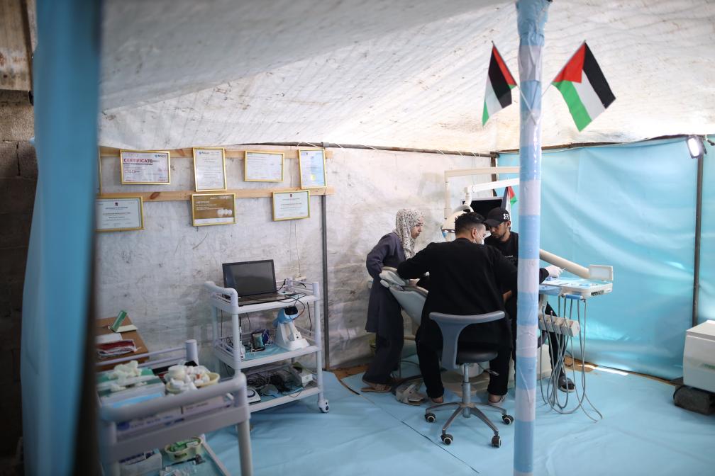 2024年3月30日,在加沙地帶的一家臨時診所,牙科醫(yī)生為患者看病。新華社發(fā)