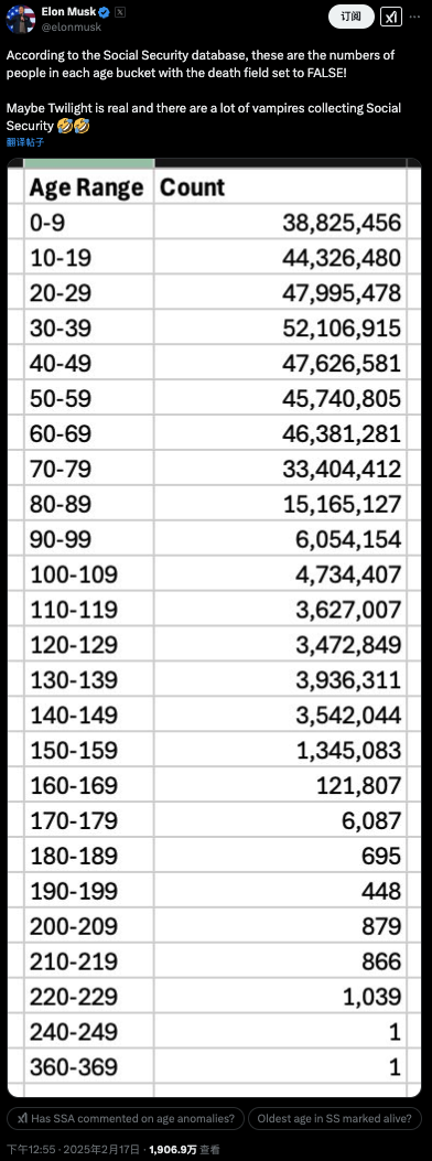 馬斯克周一公布了美國社保數(shù)據(jù)庫中,每個(gè)年齡段中“是否死亡”字段設(shè)置為否的人數(shù)。其中存在兩個(gè)問題:人數(shù)對不上和年齡太離譜。