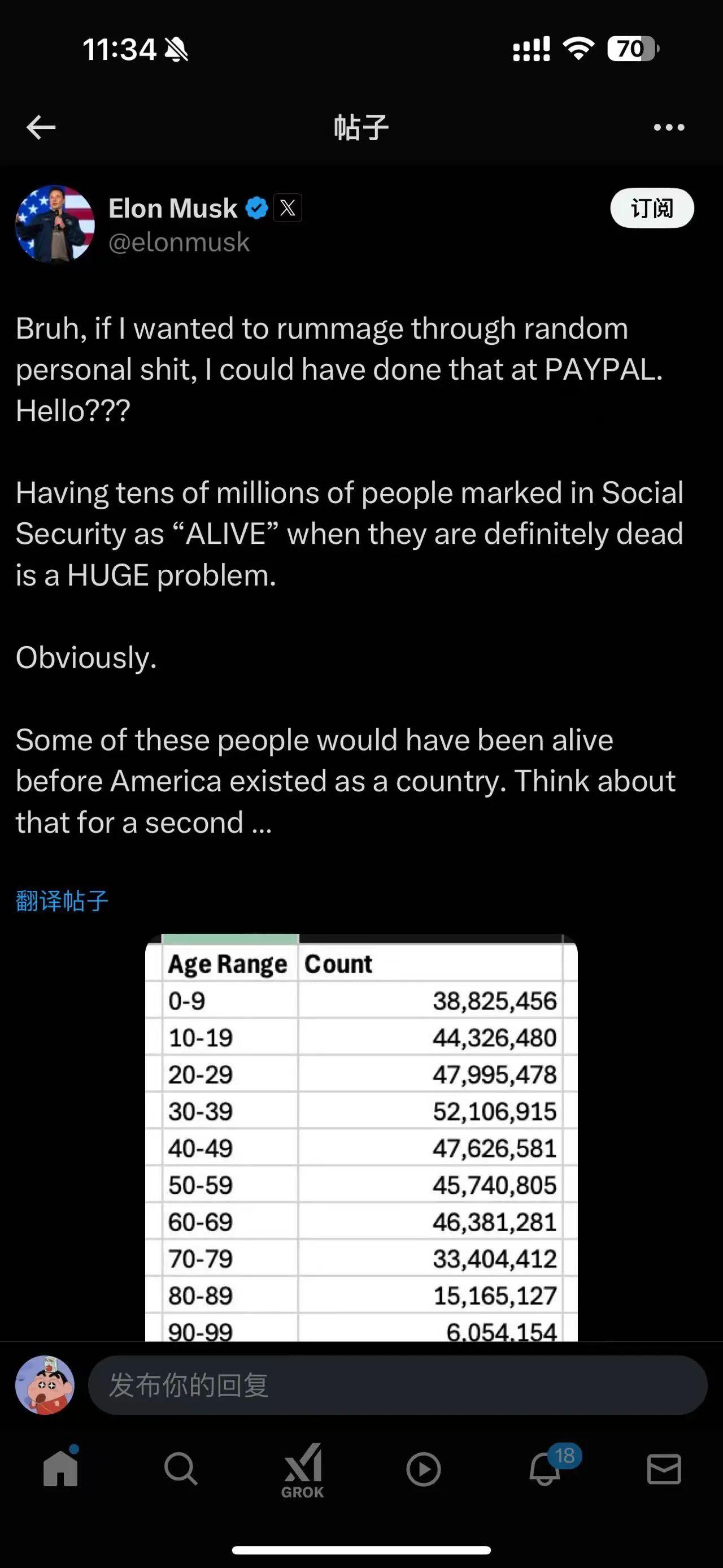 當(dāng)?shù)貢r(shí)間2月18日,馬斯克再次提到此事,稱這是一個(gè)巨大的問題,“仔細(xì)想想,他們中有些人甚至在美國建國之前就已經(jīng)活著了……”