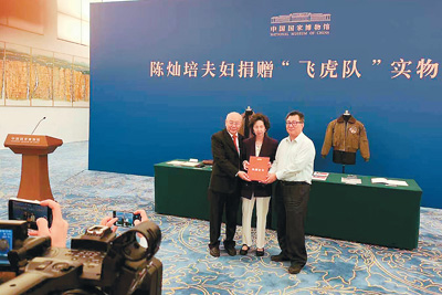 陳燦培夫婦(左一、左二)向中國國家博物館捐贈飛虎隊文物。 受訪者供圖