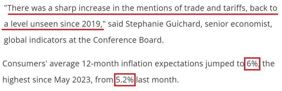 在美國CCI以三年半以來的最大速度惡化的同時,美國消費(fèi)者對未來一年的通脹預(yù)期也從5.2%大幅升高至6%,達(dá)到2023年5月以來的最高水平。這進(jìn)一步顯示,美國人對特朗普政府政策可能對經(jīng)濟(jì)造成的負(fù)面影響越來越擔(dān)憂。