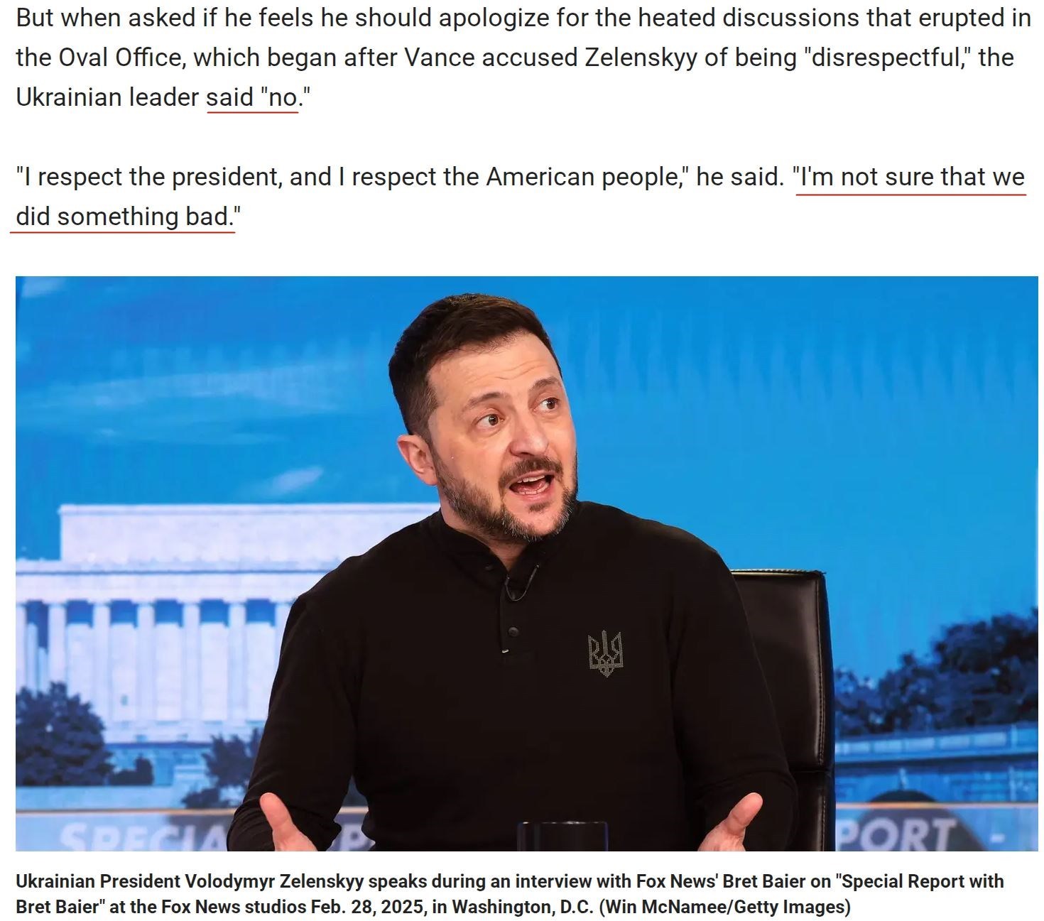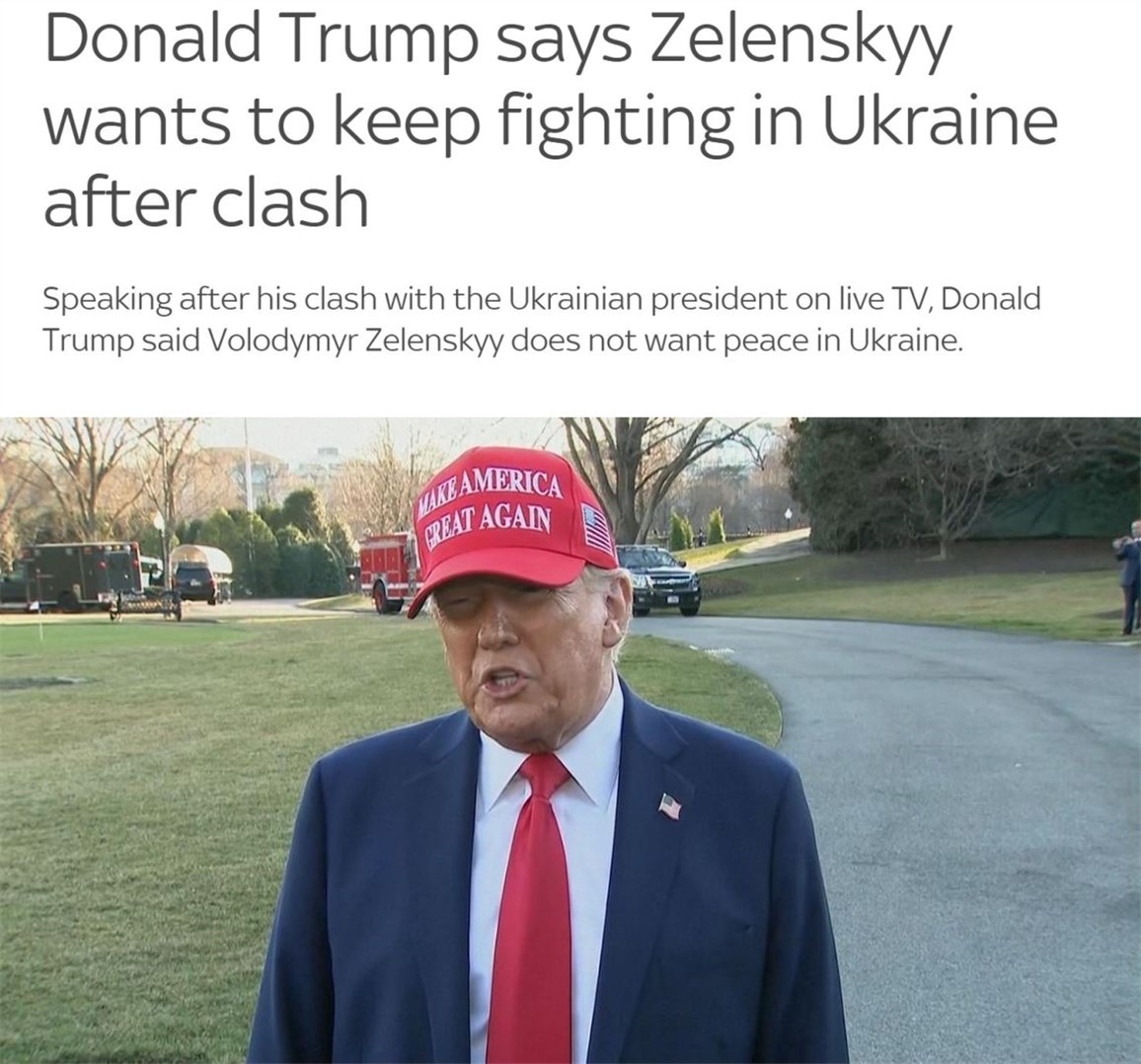 “我在橢圓形辦公室看到的是(澤連斯基對(duì)美國(guó)的)不尊重。我不知道我們能不能與澤連斯基恢復(fù)談判。還是那句話,他要么辭職,然后派一個(gè)可以與我們合作的人過(guò)來(lái),要么他自己做出改變。”