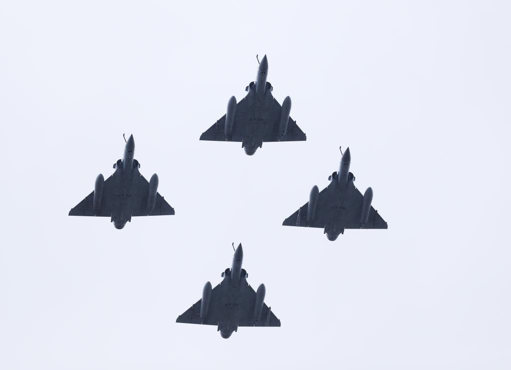這是2021年7月14日在法國巴黎協(xié)和廣場國慶閱兵式現(xiàn)場拍攝的戰(zhàn)斗機(jī)編隊(duì)。新華社記者 高靜 攝