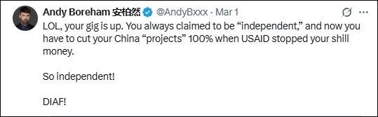 “笑死,你們?nèi)嗽O崩了。”在中國生活和工作多年的新西蘭媒體人安迪·博勒姆(中文名安柏然)也嘲諷道,“成天標榜自己‘獨立’,現(xiàn)在美國國際開發(fā)署斷了黑錢,對華‘項目’得100%砍光。還真是獨立?。≮s緊涼透吧!”