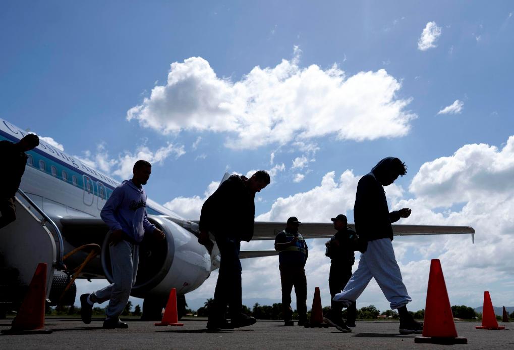 2月14日,在洪都拉斯西北部城市圣佩德羅蘇拉的拉蒙·比列達(dá)·莫拉萊斯機(jī)場(chǎng),返鄉(xiāng)移民走下飛機(jī)。新華社發(fā)(戴維攝)