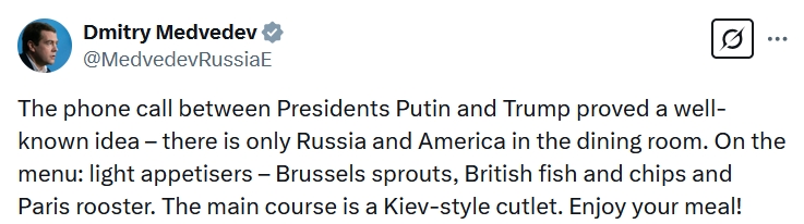俄羅斯總統(tǒng)普京同特朗普18日通電話。俄聯(lián)邦安全會議副主席梅德韋杰夫就此表態(tài)稱,這表明餐廳里只有俄美,歐洲和烏克蘭都在菜單上,歐洲是開胃小菜,而主菜是烏克蘭。