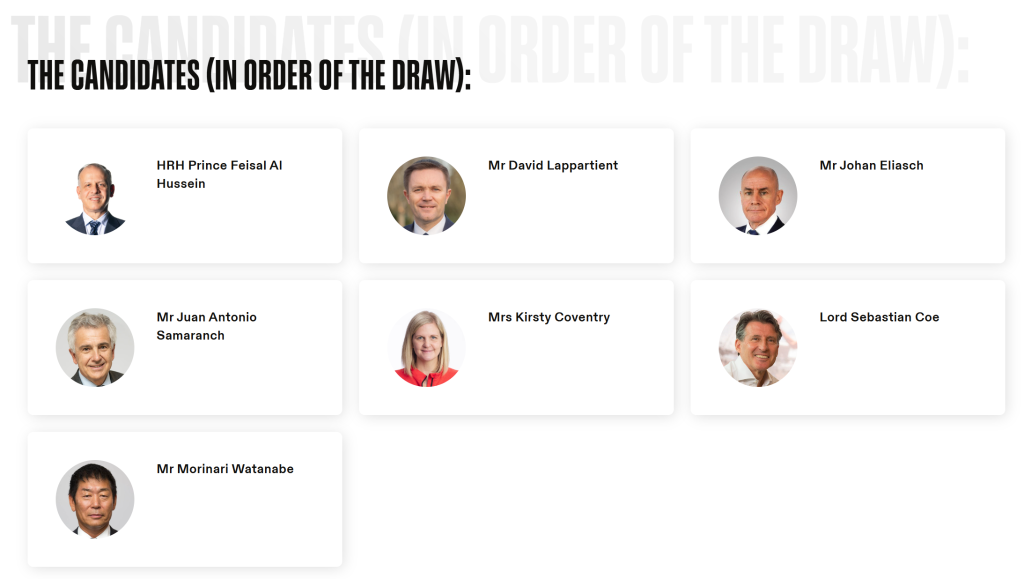 此次國(guó)際奧委會(huì)主席選舉共有創(chuàng)紀(jì)錄的七人參與,包括國(guó)際奧委會(huì)副主席小薩馬蘭奇,國(guó)際奧委會(huì)執(zhí)委、運(yùn)動(dòng)員委員會(huì)前主席柯絲蒂·考文垂,世界田聯(lián)主席塞巴斯蒂安·科,國(guó)際自行車(chē)聯(lián)盟主席大衛(wèi)·拉帕爾蒂安,國(guó)際雪聯(lián)主席約翰·埃利亞施,國(guó)際奧委會(huì)執(zhí)委費(fèi)薩爾·侯賽因和國(guó)際體操聯(lián)合會(huì)主席渡邊守成。