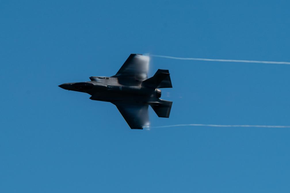 2023年10月14日,在美國休斯敦航展上,F-35閃電飛行表演隊的一架飛機進行表演。新華社發(fā)(陳晨攝)
