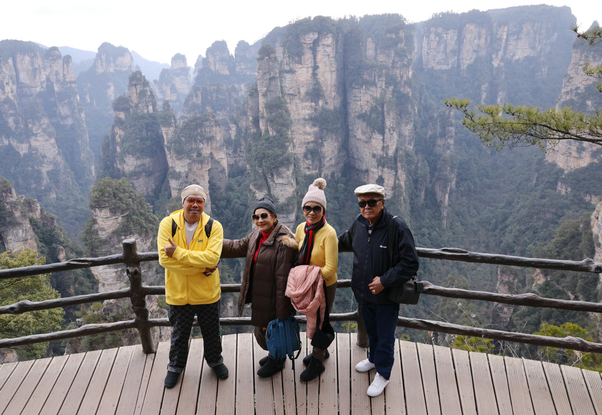 2月15日,泰國(guó)游客在張家界國(guó)家森林公園袁家界景區(qū)游玩。(圖片來(lái)源:新華社)