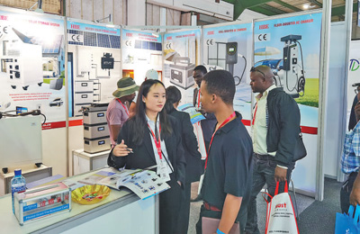 在一家中企展臺(tái),工作人員在向非洲客戶介紹該公司最新光伏儲(chǔ)能設(shè)備及其應(yīng)用場(chǎng)景。