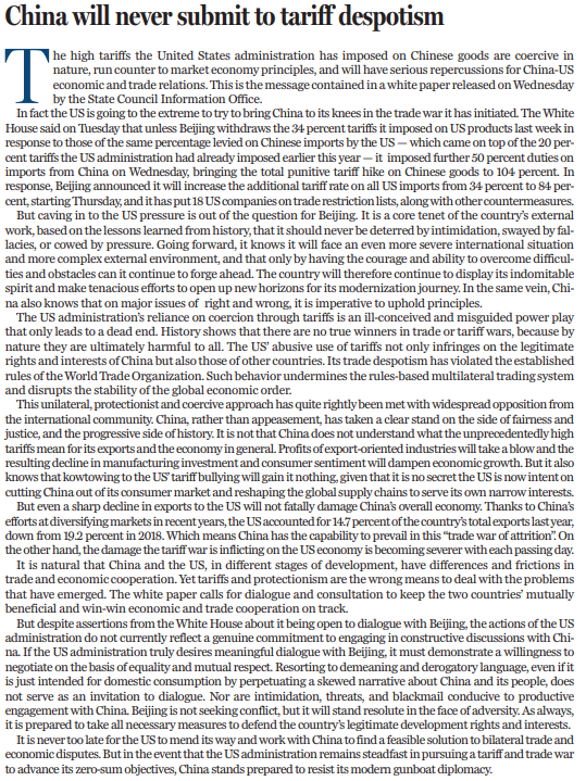 美國若能改邪歸正,與中國攜手合作,共同尋找解決雙邊經(jīng)貿(mào)摩擦的可行路徑,尚為時不晚。當然,如果美國政府執(zhí)意用關(guān)稅戰(zhàn)、貿(mào)易戰(zhàn)搞零和博弈,那么中國也已做好準備,堅決抵御美國向中國擺出的炮艦外交。