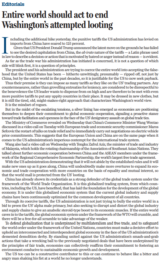 美國(guó)政府試圖脅迫全世界接受這樣一個(gè)謊言,即美國(guó)在過(guò)去幾十年中不僅被中國(guó),而且被整個(gè)世界所欺騙,因此美國(guó)現(xiàn)在加征關(guān)稅是理所當(dāng)然的。其他國(guó)家如果不卑躬屈膝地請(qǐng)求“寬大處理”,甚至采取反制措施,就會(huì)被視為對(duì)美方大不敬,美國(guó)將加以更高的懲罰性關(guān)稅,迫使敢于反抗的國(guó)家俯首稱(chēng)臣。華盛頓的世界觀(guān)也許披上了新衣,但仍然是老套的“強(qiáng)權(quán)即公理”,完全是流氓心態(tài)和強(qiáng)盜邏輯。