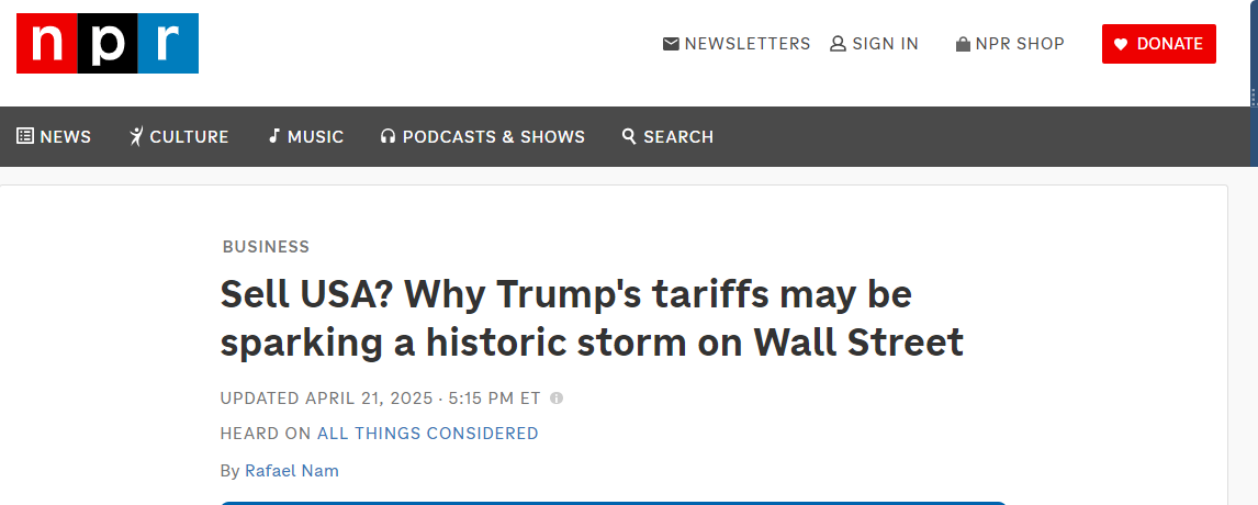 據(jù)美國國家公共廣播電臺(NPR)網(wǎng)站4月21日報道,美國金融體系過去被視為全球最穩(wěn)定和強(qiáng)大的體系之一。然而,由于美國現(xiàn)任政府4月2日推出的所謂全球“對等關(guān)稅”政策,美國金融市場出現(xiàn)了前所未有的危機(jī):全球投資者可能因美國政策的不確定性而對美國失去信心。