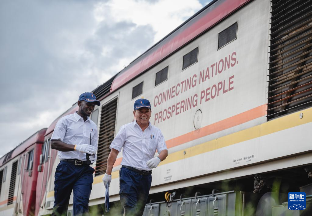 2023年5月23日,在肯尼亞內(nèi)羅畢,非洲之星鐵路運營公司機輛部的火車駕駛員蔣立平(右)與學(xué)員霍勒斯從一輛印有“連接國家 走向繁榮”標語的蒙內(nèi)鐵路機車旁走過。 新華社記者 王冠森 攝