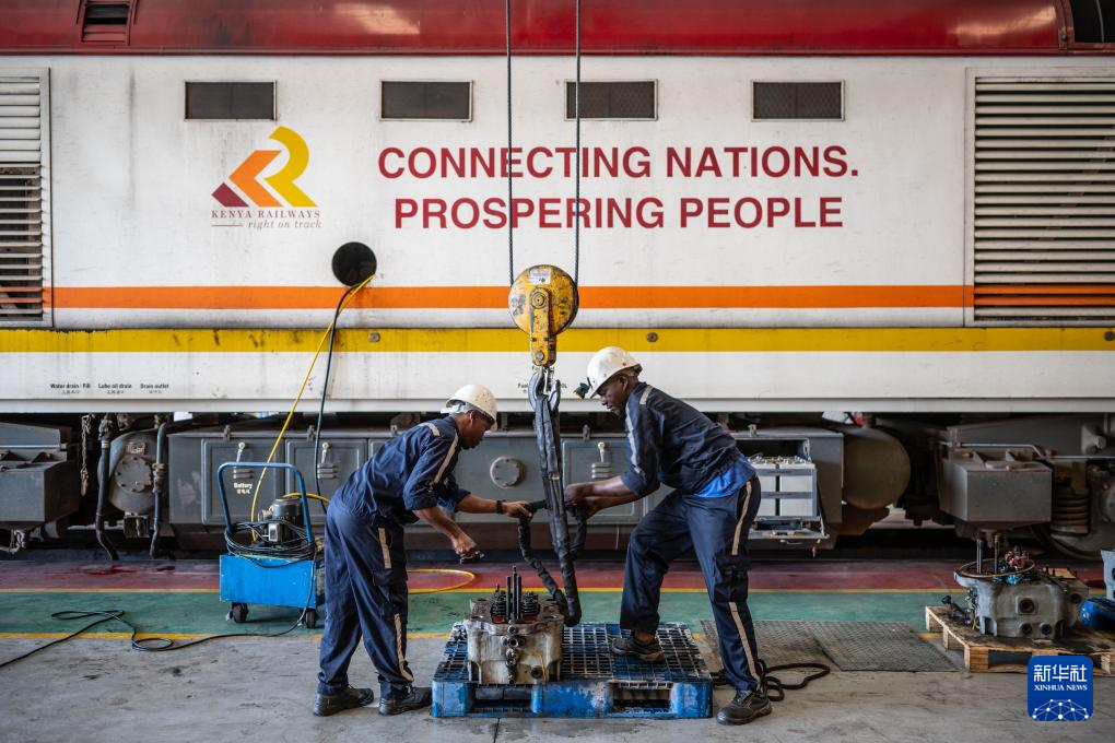 2025年1月23日,在肯尼亞內(nèi)羅畢蒙內(nèi)鐵路車間,維保人員在一輛印有“連接國家 走向繁榮”標語的蒙內(nèi)鐵路機車前檢修配件。 新華社記者 王冠森 攝