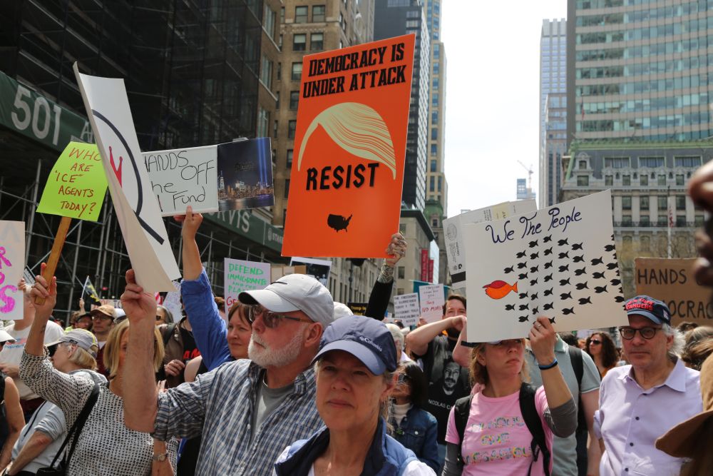 4月19日,人們在美國紐約街頭參加抗議活動。美國多地19日舉行抗議活動,首都華盛頓、紐約、舊金山、波士頓等城市的民眾走上街頭,抗議現(xiàn)政府大規(guī)模裁員、加征關稅、驅逐移民等政策。新華社記者劉亞南攝
