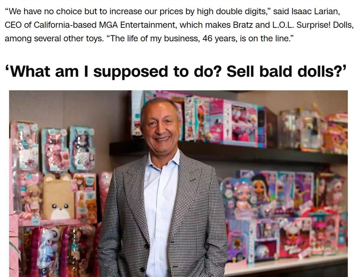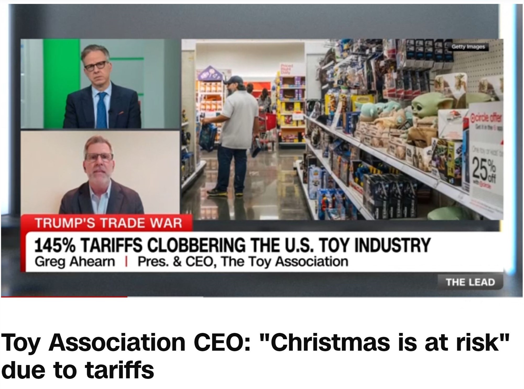 以玩具行業(yè)為例,代表全美850多家玩具制造商的玩具協(xié)會首席執(zhí)行官格雷格·阿赫恩對媒體直言,美國玩具行業(yè)高達(dá)96%的制造商和公司都是中小企業(yè),在現(xiàn)行的關(guān)稅稅率下,它們冒不起風(fēng)險。