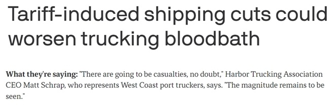 港口卡車(chē)運(yùn)輸協(xié)會(huì)首席執(zhí)行官馬特·施拉普表示,關(guān)稅政策若繼續(xù)下去,將嚴(yán)重影響整個(gè)物流行業(yè),“卡車(chē)公司將失去業(yè)務(wù),倉(cāng)庫(kù)也沒(méi)有存儲(chǔ)業(yè)務(wù),甚至連碼頭裝卸工也沒(méi)有那么多工作了”。