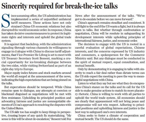 近期,美方不斷表示,希望同中方就關(guān)稅調(diào)整進(jìn)行談判。當(dāng)?shù)貢r(shí)間10日上午,中美經(jīng)貿(mào)高層會(huì)談在瑞士日內(nèi)瓦開始舉行。中共中央政治局委員、國務(wù)院副總理何立峰作為中美經(jīng)貿(mào)中方牽頭人,當(dāng)天與美方牽頭人、美國財(cái)長貝森特舉行會(huì)談。中美關(guān)稅戰(zhàn)迎來破冰契機(jī)。