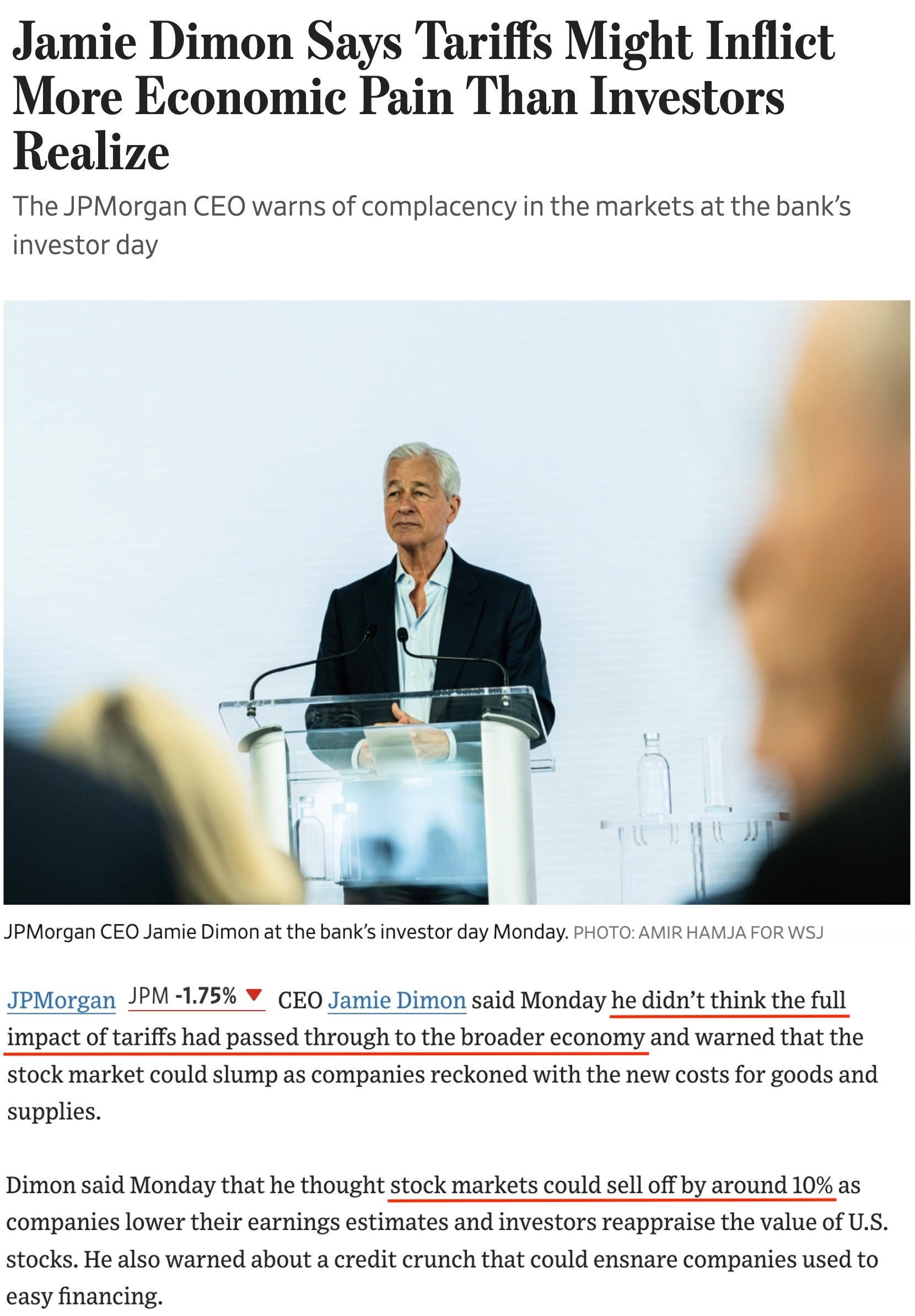 摩根大通公司首席執(zhí)行官杰米·戴蒙近日指出,關(guān)稅的全部影響尚未傳導(dǎo)至整體經(jīng)濟(jì),通脹加劇和滯脹的可能性比人們認(rèn)為的要大,隨著企業(yè)下調(diào)利潤(rùn)預(yù)期以及投資者重新評(píng)估美國(guó)股票的價(jià)值,股市可能下跌約10%。