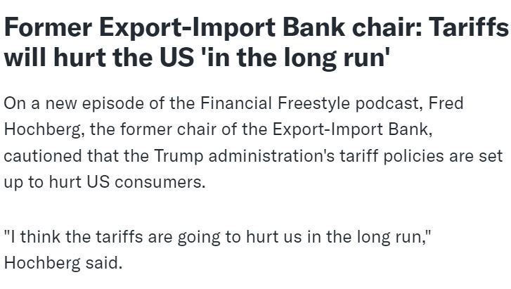 美國(guó)進(jìn)出口銀行前行長(zhǎng)弗雷德·霍奇伯格也曾警告稱,美國(guó)政府的關(guān)稅政策將對(duì)美國(guó)經(jīng)濟(jì)和消費(fèi)者造成長(zhǎng)期傷害。
