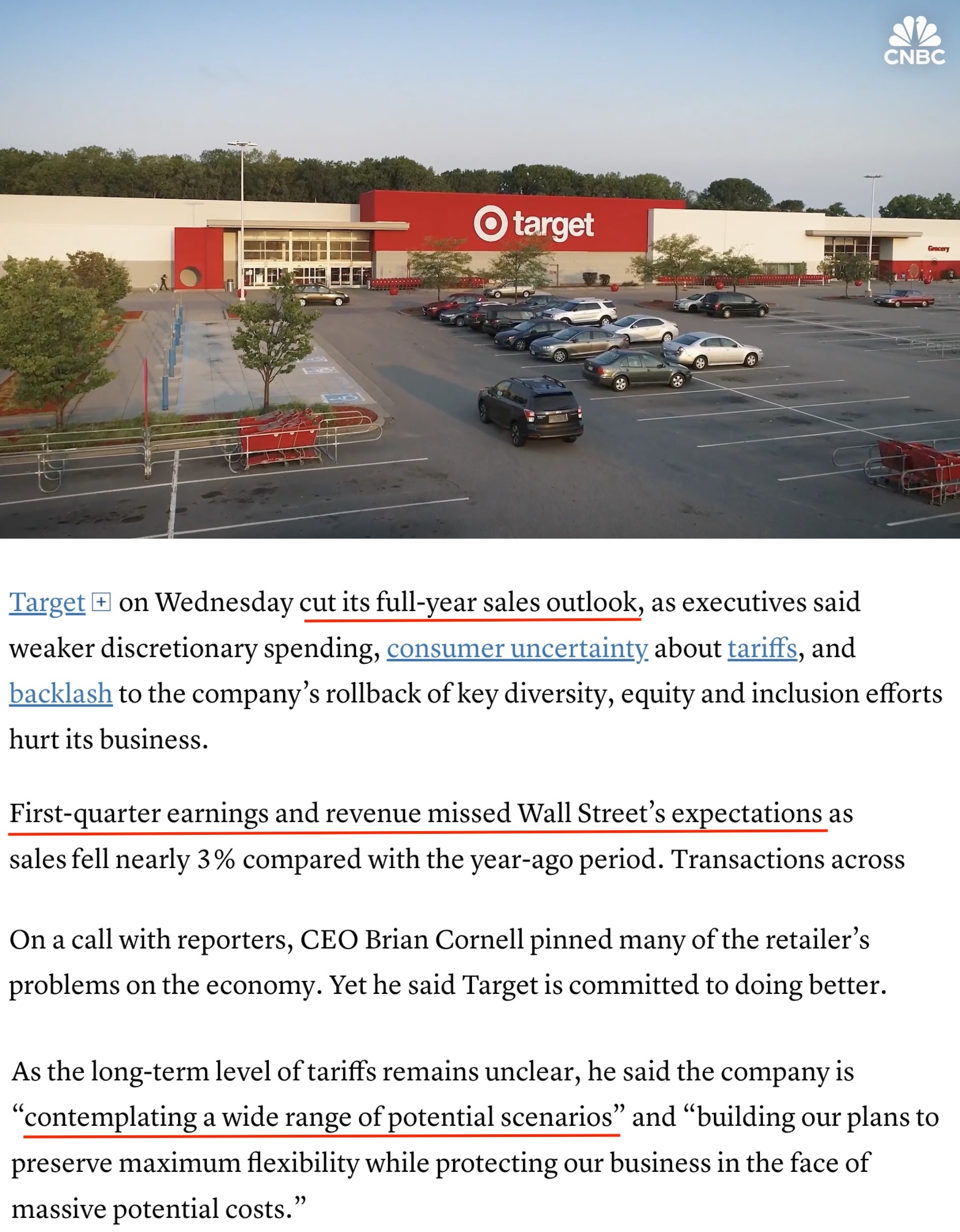 美國(guó)知名零售商塔吉特百貨公司第一季度的收益和收入均低于預(yù)期。由于業(yè)務(wù)受到關(guān)稅的不確定性等因素?fù)p害,該公司21日下調(diào)了全年銷售預(yù)期。