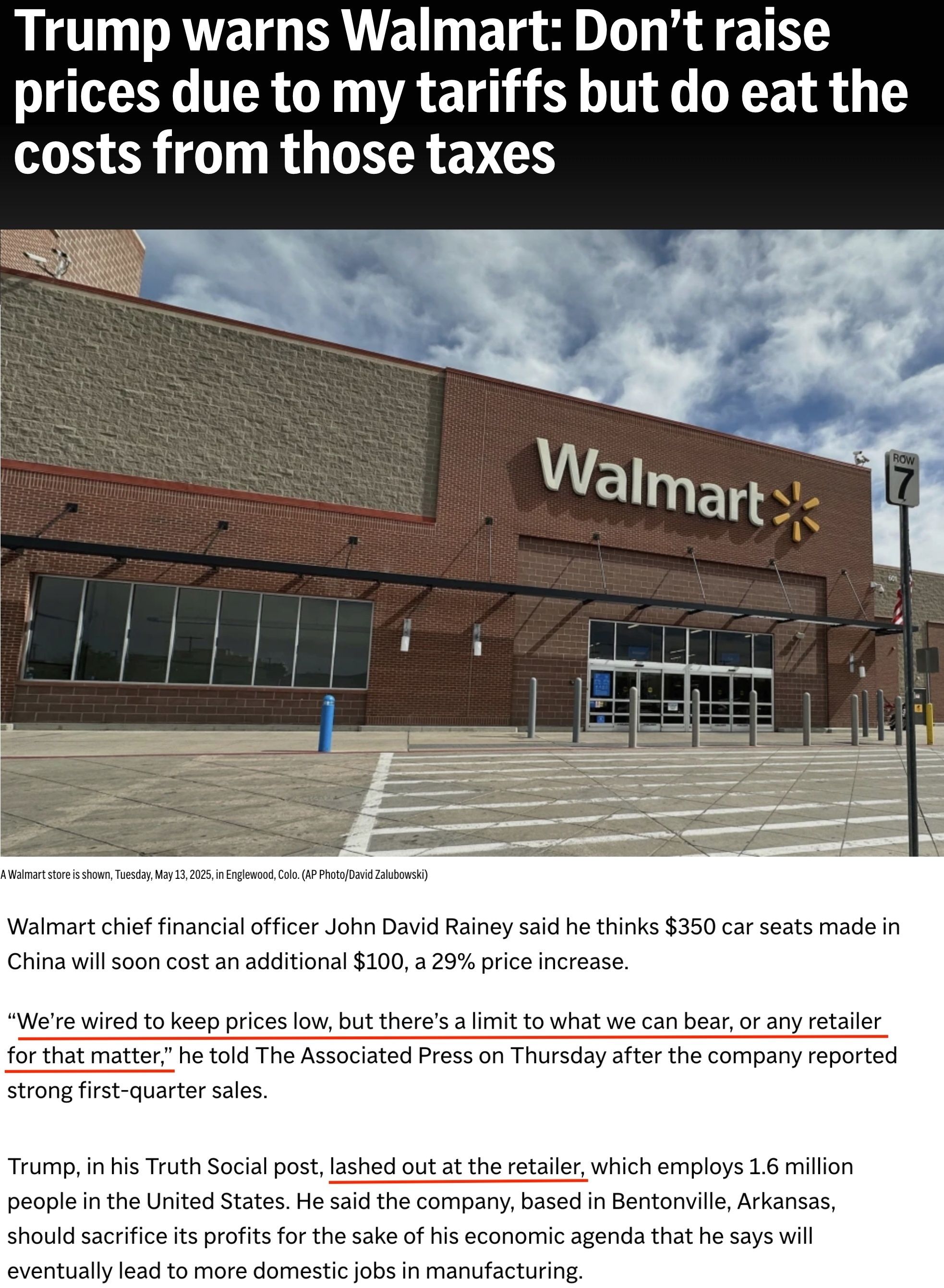 美國(guó)最大零售業(yè)企業(yè)沃爾瑪?shù)臐q價(jià)預(yù)告甚至惹惱了總統(tǒng)特朗普。特朗普在社交媒體上發(fā)文抨擊沃爾瑪將全面漲價(jià)歸咎于關(guān)稅,稱該公司應(yīng)該承擔(dān)美國(guó)關(guān)稅政策所帶來的額外成本,而不是向顧客收費(fèi)。