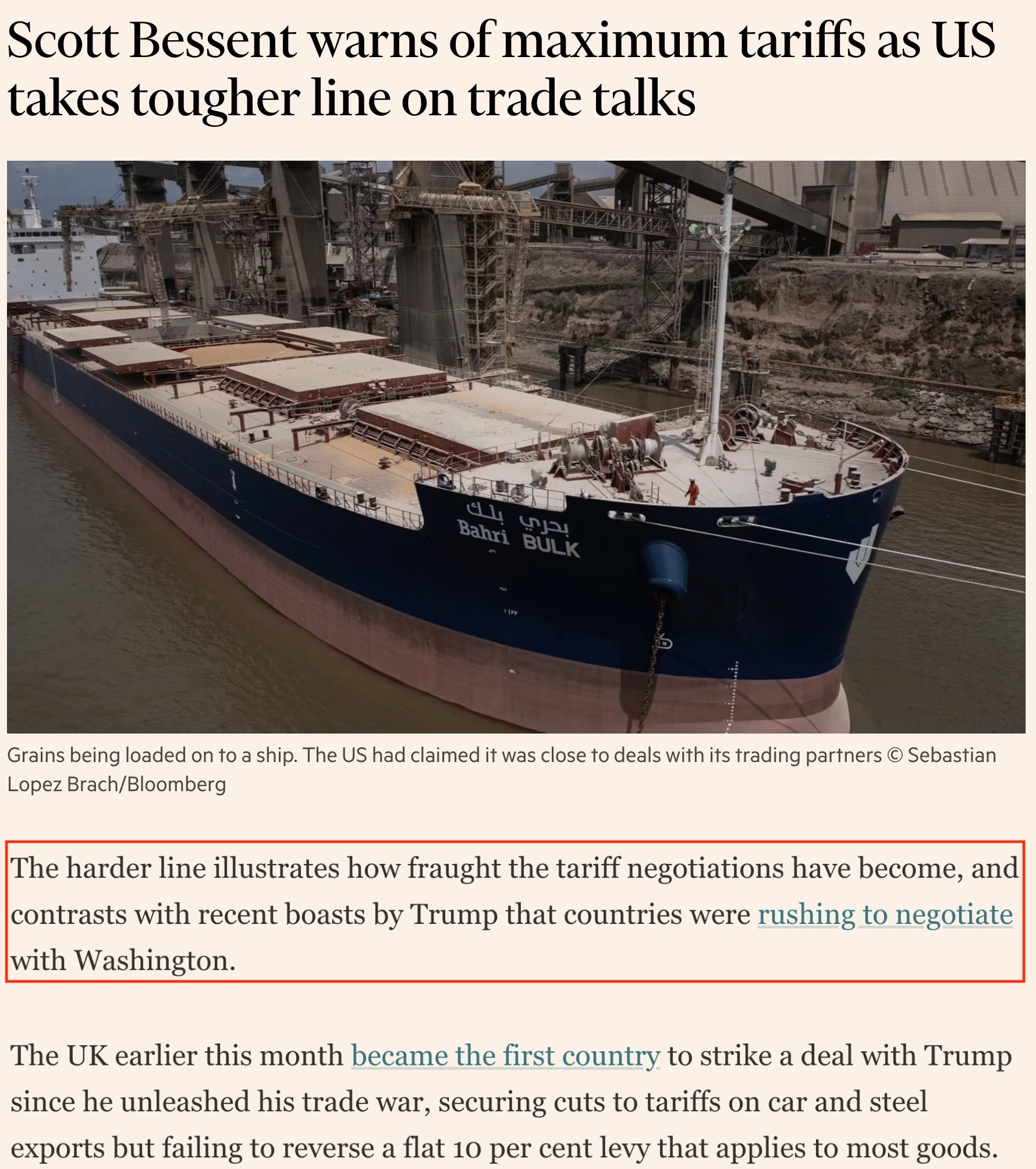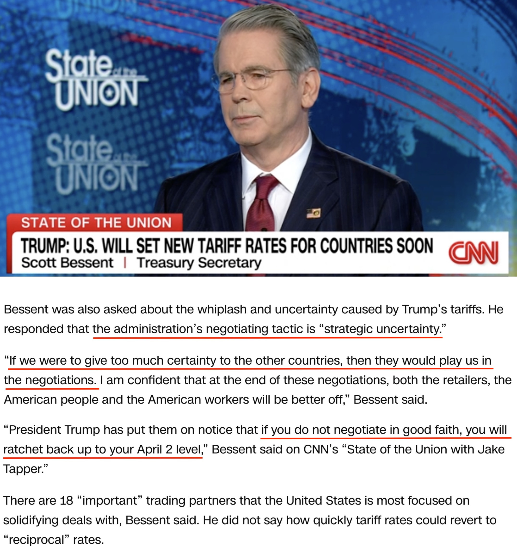 貝森特表示,美國(guó)政府正專注于與18個(gè)最重要的貿(mào)易伙伴,如果對(duì)方?jīng)]有“誠(chéng)意”,他們的關(guān)稅稅率將回到4月2日的“對(duì)等”水平。