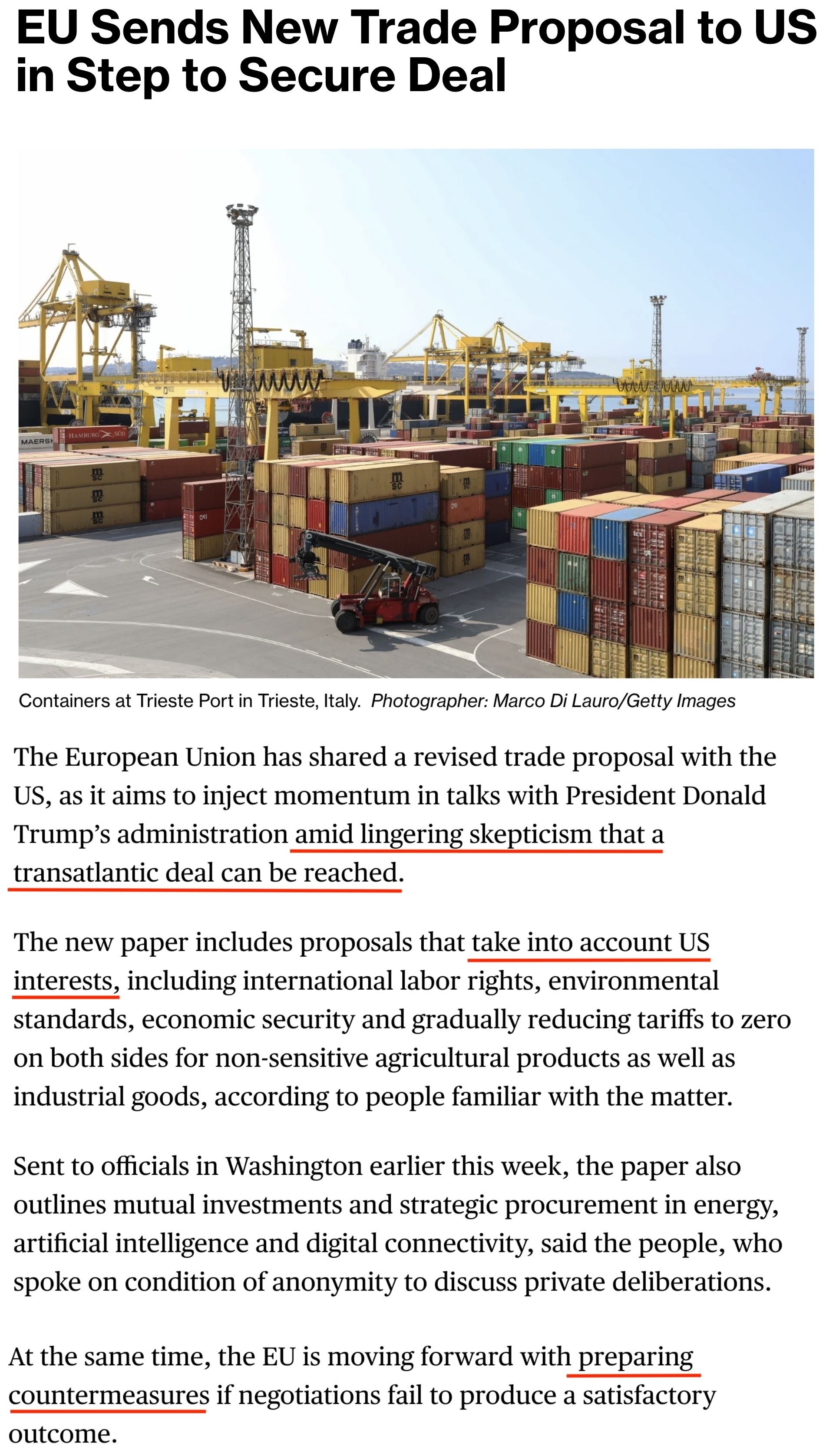 新提案包含了考慮美國(guó)利益的提議,包括國(guó)際勞工權(quán)利、環(huán)境標(biāo)準(zhǔn)、經(jīng)濟(jì)安全,并逐步將雙方非敏感農(nóng)產(chǎn)品以及工業(yè)品的關(guān)稅降至零。另外還涉及在能源、人工智能和數(shù)字互聯(lián)領(lǐng)域的相互投資和戰(zhàn)略采購(gòu)等。