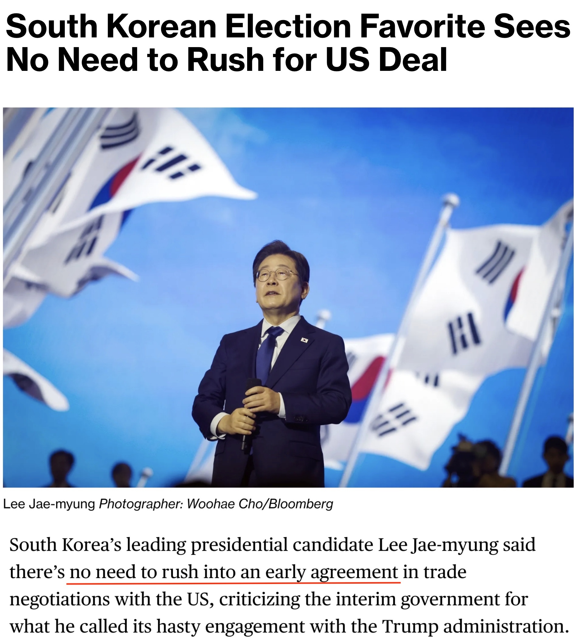 彭博社指出,盡管官員們不愿公開表示他們的態(tài)度變得強(qiáng)硬,但有跡象表明,一些國(guó)家已經(jīng)意識(shí)到手中的牌比之前認(rèn)為的多,因此可以放慢談判的步伐。比如目前韓國(guó)民調(diào)領(lǐng)先的總統(tǒng)候選人李在明就表示,沒必要急于與美國(guó)達(dá)成貿(mào)易協(xié)議。