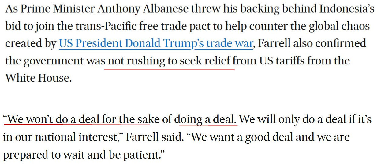 澳大利亞貿(mào)易部長(zhǎng)法瑞爾近期也公開表示,澳大利亞政府不急于向美國(guó)方面尋求關(guān)稅減免。