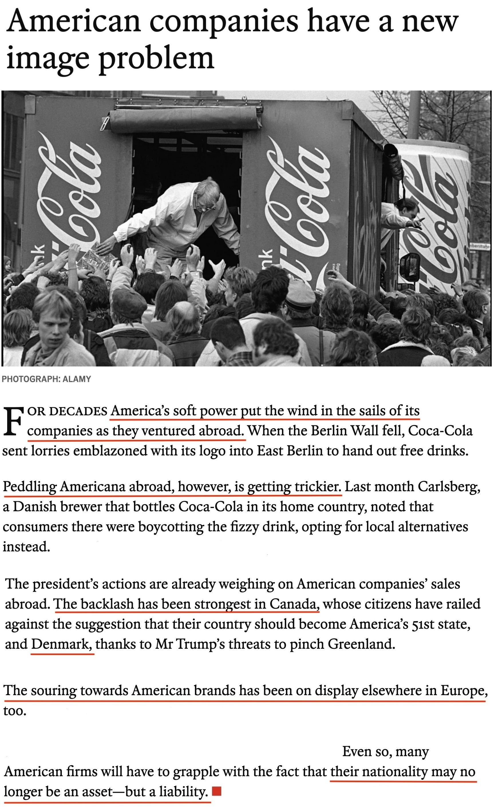 美國(guó)的行為已經(jīng)開始影響美國(guó)公司的海外銷售額。被美國(guó)威脅吞并領(lǐng)土的加拿大和丹麥的抵制情緒最強(qiáng)烈。不僅如此,歐洲其他地區(qū)的消費(fèi)者對(duì)美國(guó)品牌的反感也顯現(xiàn)出來。