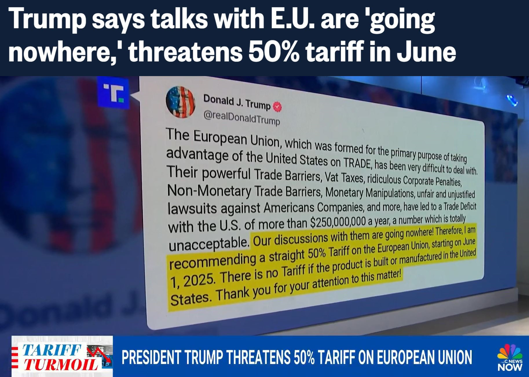 美國(guó)總統(tǒng)特朗普23日在社交媒體發(fā)文威脅稱,由于美國(guó)與歐盟的談判“毫無進(jìn)展”,他建議從6月1日起對(duì)來自歐盟的商品征收50%的關(guān)稅。