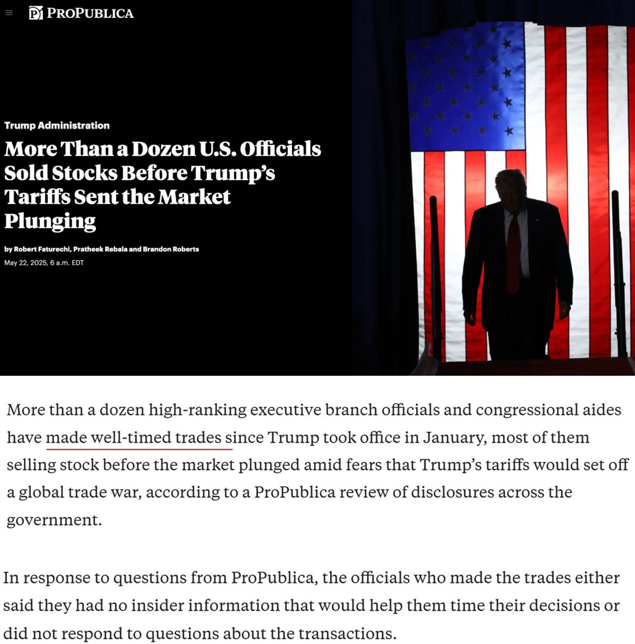 最近,美國(guó)“專業(yè)公眾”新聞?wù){(diào)查網(wǎng)站在查詢了數(shù)百份證券交易披露報(bào)告后發(fā)現(xiàn),自本屆美國(guó)政府1月上臺(tái)以來,有十幾名美國(guó)政府高級(jí)官員、國(guó)會(huì)工作人員乃至國(guó)會(huì)議員進(jìn)行了時(shí)機(jī)“恰到好處”的交易,其中大部分人在美國(guó)關(guān)稅政策導(dǎo)致市場(chǎng)暴跌之前拋售了股票;還有人則在相關(guān)法案獲批前“及時(shí)”購(gòu)買了該法案所利好的行業(yè)公司股票。