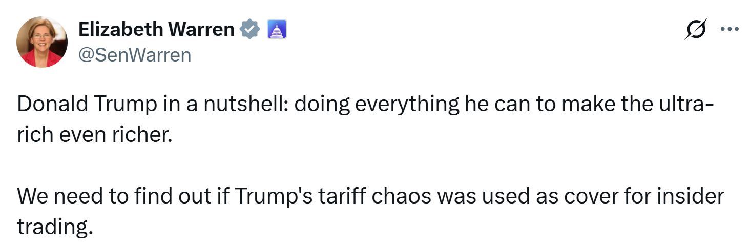美國(guó)民主黨籍聯(lián)邦參議員伊麗莎白·沃倫表示,鑒于特朗普政府正盡一切可能讓美國(guó)富人們更加富有,有必要弄清楚白宮制造的關(guān)稅混亂是否被用作內(nèi)幕交易的掩護(hù)。