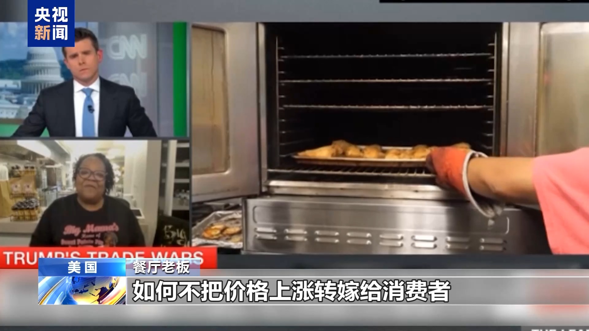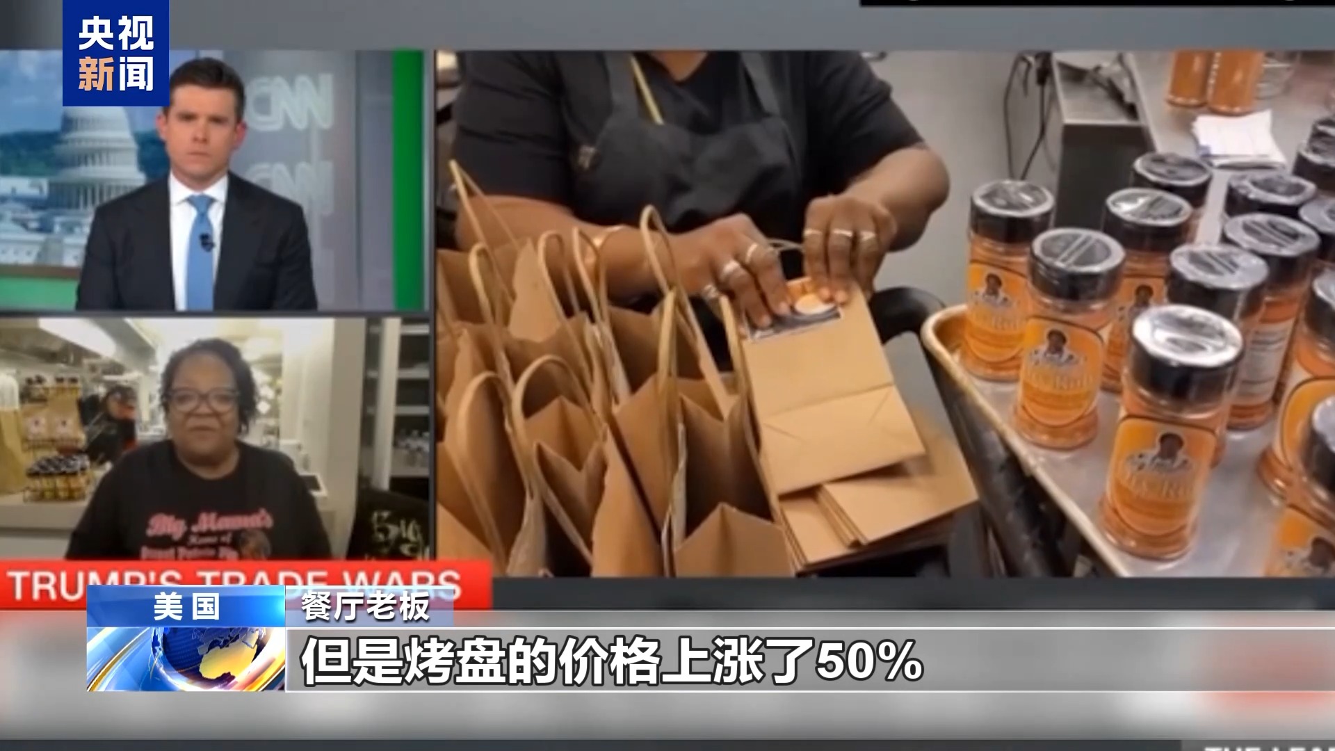 餐廳老板:我們餐廳的炸雞產(chǎn)品上過(guò)電視臺(tái)的節(jié)目,我們也在線上賣調(diào)料產(chǎn)品,這是關(guān)稅影響最大的地方。另外就是餐廳的供應(yīng),比如我們使用谷物面包,我們一般用鋁箔烤盤制作面包,但是烤盤的價(jià)格上漲了50%,所以我們現(xiàn)在換回平底鍋制作面包。