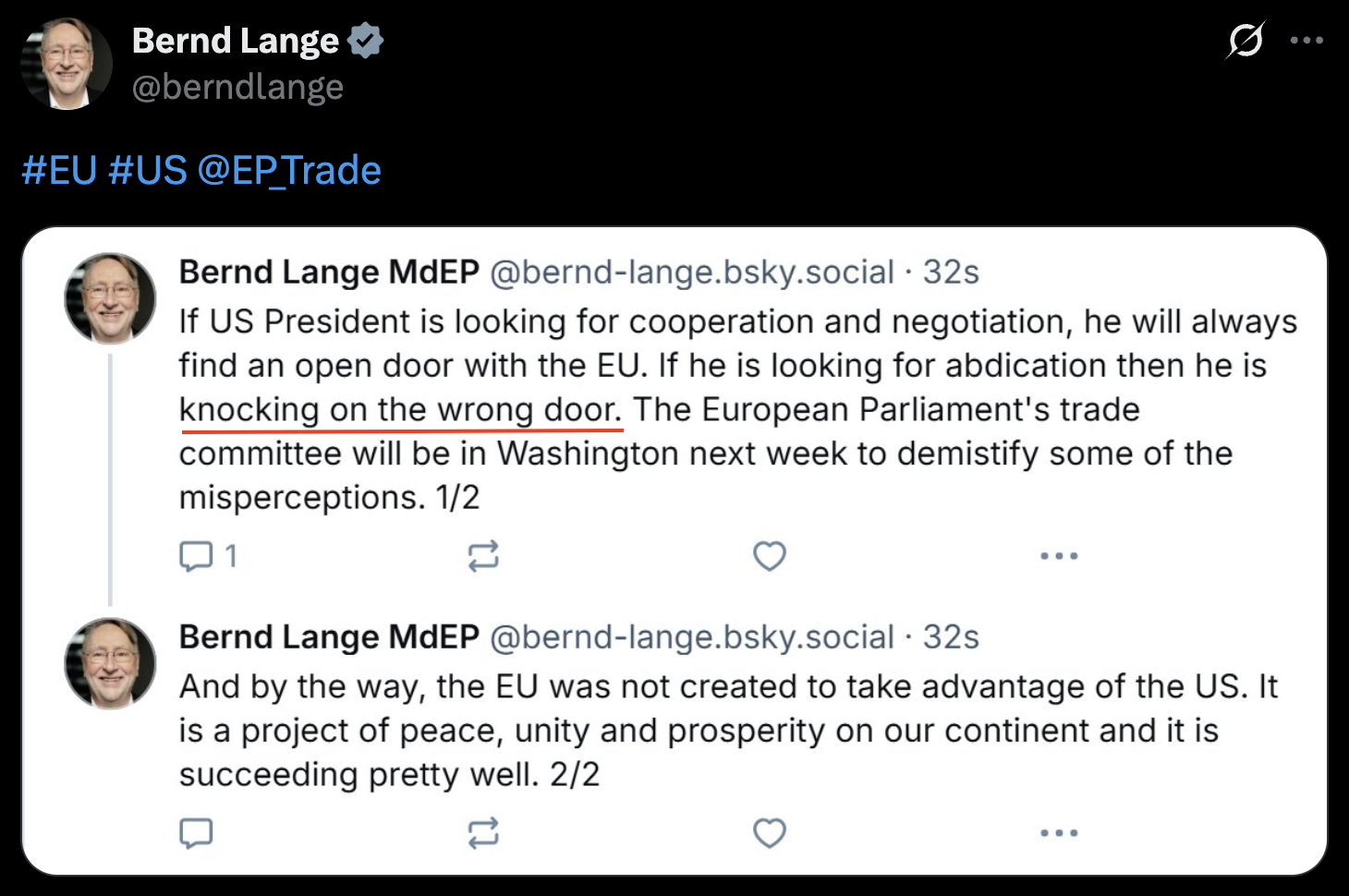 “如果美國尋求合作與談判,歐盟總是愿意敞開大門;但如果只是想讓我們照單全收美方的要求,那它就是敲錯(cuò)了門。”