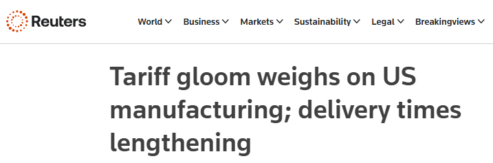 路透社近日的一篇報道認為,美國制造業(yè)5月連續(xù)第三個月萎縮,在關(guān)稅影響下,供應(yīng)商交付投入的時間是近三年來最長的,這可能預(yù)示著某些商品即將出現(xiàn)短缺。