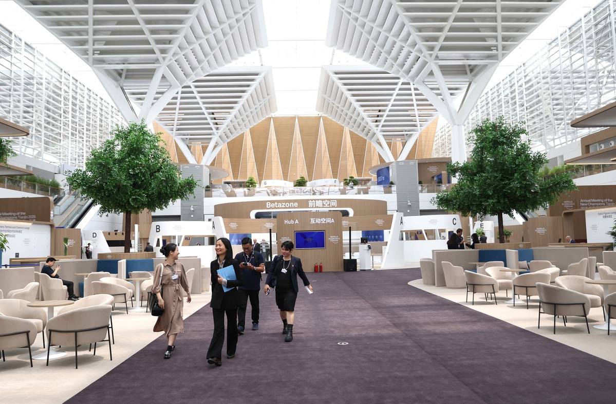 2025年6月23日,嘉賓在國家會(huì)展中心(天津)內(nèi)的2025夏季達(dá)沃斯論壇新領(lǐng)軍者村交流。