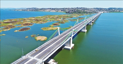 隨著坦桑尼亞總統(tǒng)哈桑揮動國旗,示意車輛可以通行,等待駛過馬古富力大橋的首批車輛紛紛啟動。身穿當?shù)貍鹘y(tǒng)服飾的民眾載歌載舞,現(xiàn)場歡呼聲、歌聲、掌聲交織在一起……日前,由中國土木與中鐵十五局聯(lián)合承建的非洲最長矮塔斜拉橋——坦桑尼亞馬古富力大橋(見圖,中國土木供圖)建成通車。橫跨維多利亞湖的馬古富力大橋如一道飛虹連通兩岸,成為中非友誼新地標。