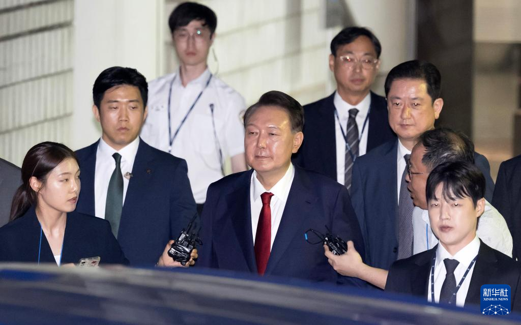 7月9日晚,韓國(guó)前總統(tǒng)尹錫悅接受訊問(wèn)后走出首爾中央地方法院。新華社/紐西斯通訊社