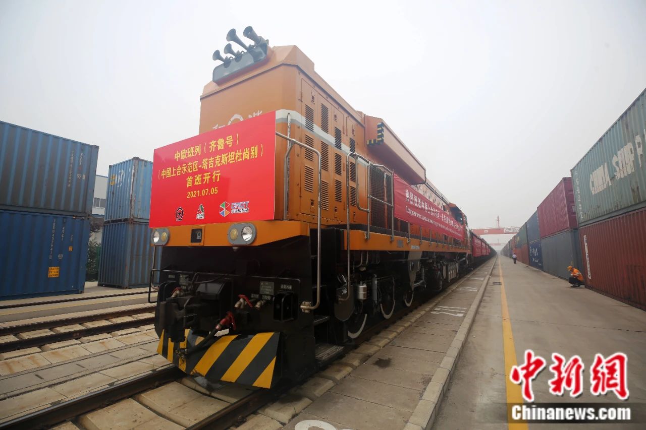 2021年7月5日, 中國(guó)—上海合作組織地方經(jīng)貿(mào)合作示范區(qū)(簡(jiǎn)稱“上合示范區(qū)”)前往塔吉克斯坦首都杜尚別的首班中歐班列(齊魯號(hào))“上合快線”發(fā)出,從上合示范區(qū)青島多式聯(lián)運(yùn)中心啟程。中新社記者 胡耀杰 攝