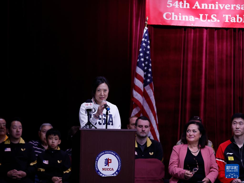 7月13日,美國(guó)乒協(xié)首席執(zhí)行官沈偉妮在美國(guó)內(nèi)華達(dá)州拉斯維加斯舉辦的紀(jì)念中美“乒乓外交”54周年暨中美乒乓球友好交流活動(dòng)上致辭。新華社發(fā)(邱晨攝)