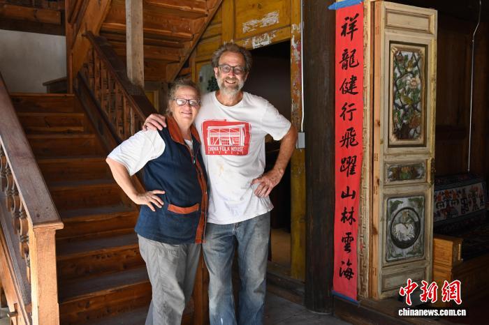 圖為約翰·弗勞爾夫婦在中國(guó)民居前合影。中新社記者 陳孟統(tǒng) 攝