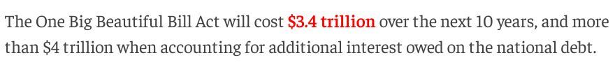 根據(jù)美國國會預(yù)算辦公室(CBO)上月做出的評估,“大而美”法案預(yù)計(jì)將在未來十年使美聯(lián)邦政府財(cái)政赤字增加約3.4萬億美元;如果算上同期的額外美債利息,新增赤字更是將超過4萬億美元。