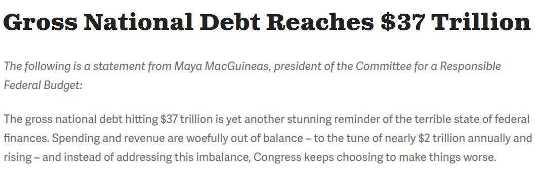 “(美國)國家債務(wù)總額達(dá)到37萬億美元的現(xiàn)實(shí)再次令人震驚地凸顯出聯(lián)邦財(cái)政的糟糕狀況。支出和收入嚴(yán)重失衡每年造成近2萬億美元的財(cái)政赤字,然而美國國會不僅沒有解決這種財(cái)政失衡,反而一直選擇讓事情變得更糟?!?/p>