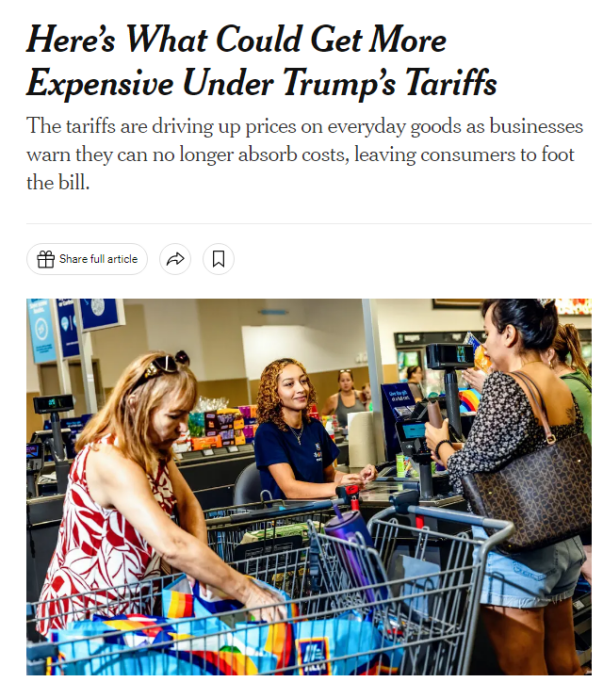 美國(guó)政府此前公布的經(jīng)過(guò)調(diào)整的“對(duì)等關(guān)稅”已經(jīng)生效,美數(shù)十個(gè)貿(mào)易伙伴將被征收10%至41%不等的關(guān)稅,隨之而來(lái)的便是被關(guān)稅推高的物價(jià)。美國(guó)《紐約時(shí)報(bào)》刊文稱,美國(guó)消費(fèi)者或許很快就會(huì)發(fā)現(xiàn),大到汽車,小到一雙鞋和一根香蕉,幾乎所有商品的售價(jià)都會(huì)上漲。