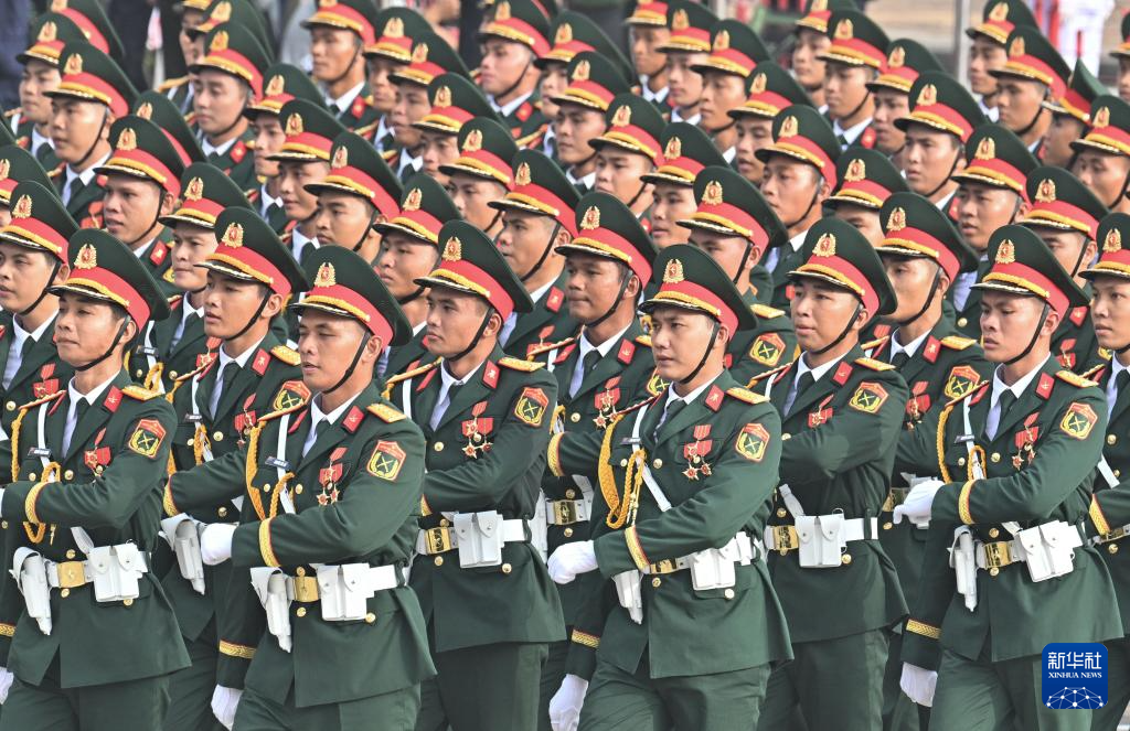 9月2日,在越南河內(nèi)巴亭廣場(chǎng),越南軍隊(duì)方陣走向主席臺(tái)接受檢閱。新華社記者 胡佳麗 攝