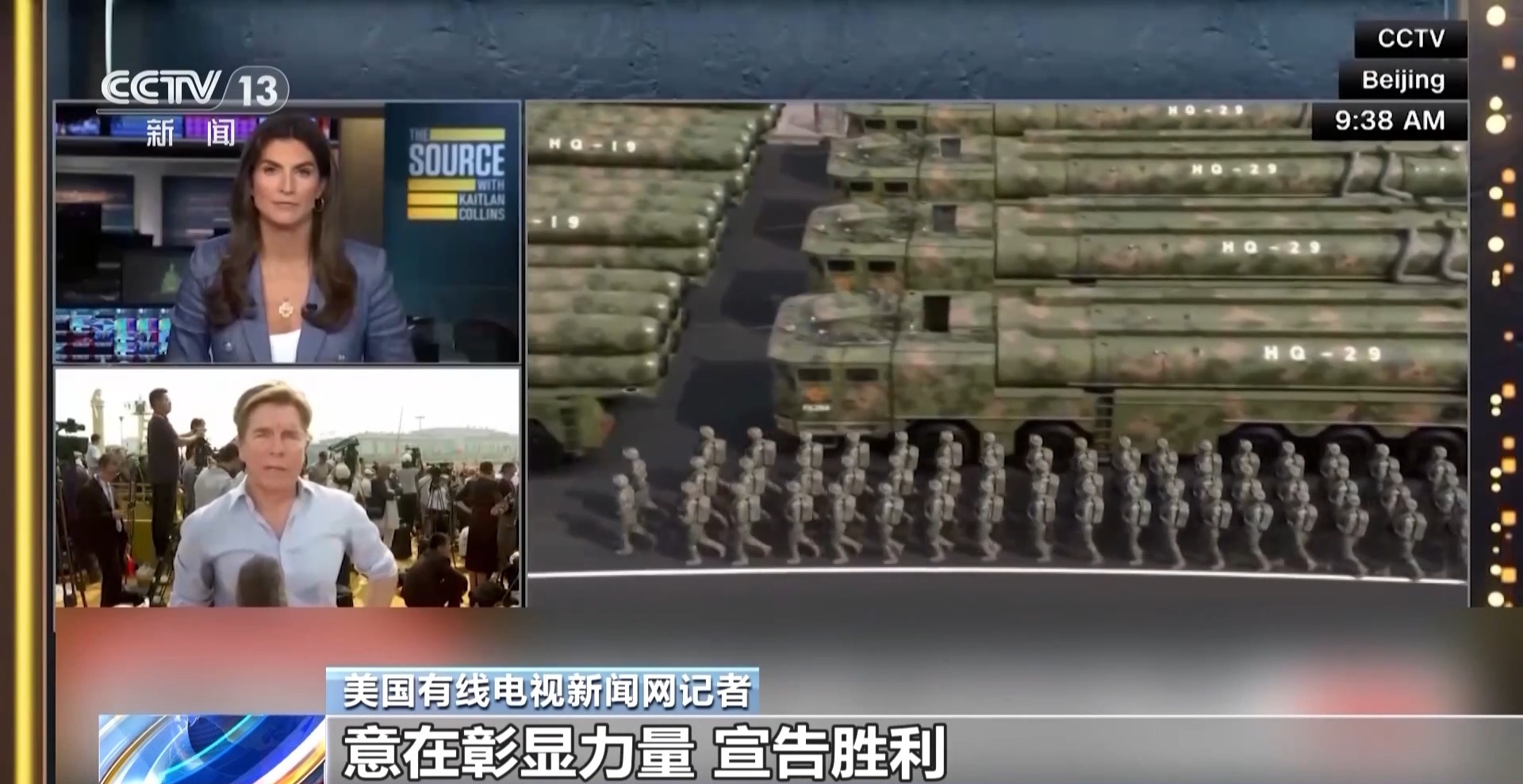 美國有線電視新聞網(wǎng)主持人:今晚此刻,我們正在關(guān)注北京這場(chǎng)盛大閱兵的現(xiàn)場(chǎng)直播畫面 。